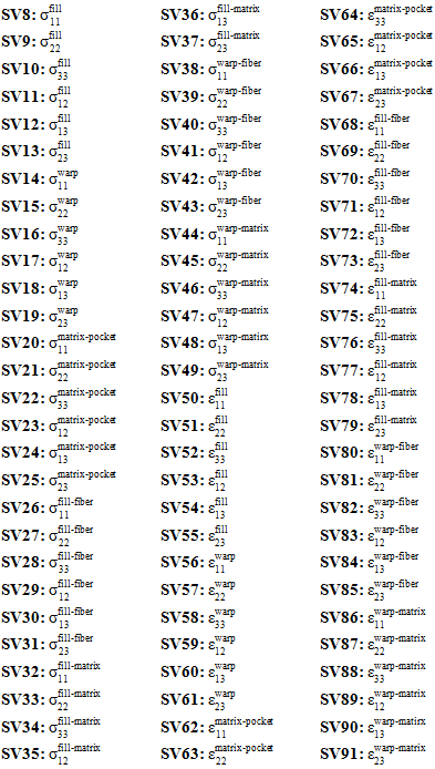 織物複合材料では、状態変数 SV3、SV4、...、SV91 の静的進行性破損解析に対する解釈は、次のとおりです。
