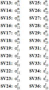 一方向複合材料を使用する進行性疲労解析の場合、SV9~SV32 は、母材の平均の応力状態とひずみ状態、および繊維の平均の応力状態とひずみ状態の個別の成分を格納するために使用します(静的解析の SV13~SV36と同等)。