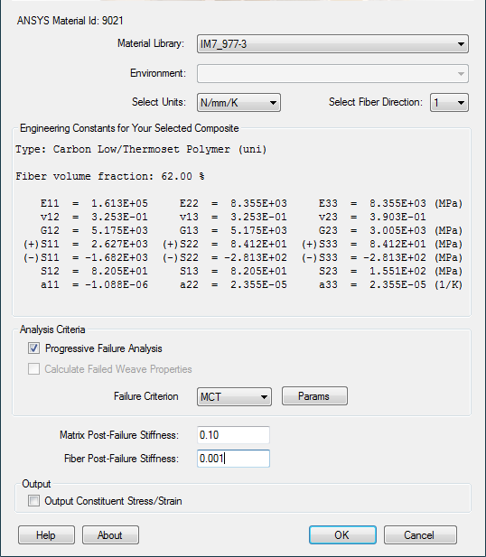 - マテリアル ライブラリのリストから、IM7_977-3 を選択します。ANSYS 材料 ID、9021 を書き留めておきます。この番号は後で、この材料を複合材料レイヤに割り当てるときに必要になります。