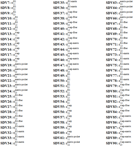 織物複合材料を使用した進行性疲労解析の場合、SDV11~SDV94 は、さまざまなスーパー構成および構成の平均の応力状態とひずみ状態の個別の成分を格納するために使用されます(静的解析の SDV7~SDV90 と同等)。