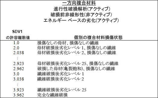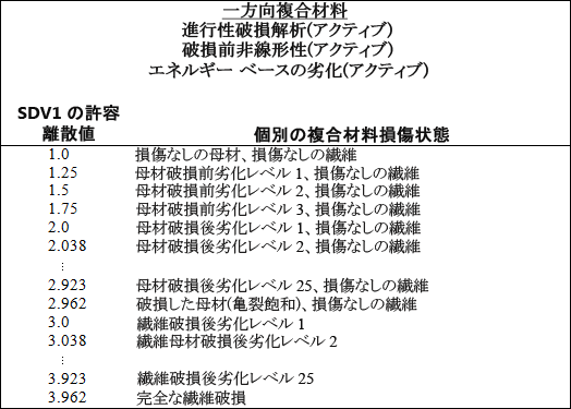 一方向複合材料では、状態変数 SDV2、SDV3、...、SDV35 の進行性疲労解析に対する解釈は、次のとおりです。