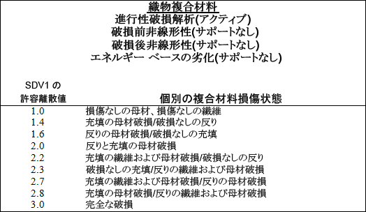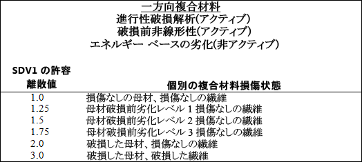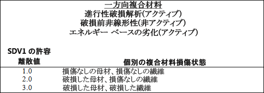 SDV1 (MAT_STATE とよく名前を変更される)は、複合材料の個別の損傷状態を表す実変数です。これは 1~3 の間の離散値の有限数と仮定されます。SDV1 によって仮定される離散値の数と離散値の解釈は、複合材料タイプ(一方向または織物)、および材料の応答を説明するために使用する材料の特定の非線形性機能セットによって異なります。次の表は、使用可能な複合材料タイプと材料の非線形性機能セットの各組み合わせに対する SDV1 の各許容離散値の解釈を示します。