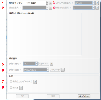 が、このエネルギー、繊維破損時の複合材料の応力状態、および要素の体積に基づいて線形に劣化します。エネルギー値計算の詳細については、「付録 A」および「理論マニュアル」を参照してください。 上記の選択が完了したら、GUI 上で[OK]ボタンをクリックして、Simulation Composite Analysis と互換性のあるユーザ定義の複合材料を作成します。[OK]ボタンをクリックすると、新しい材料が Abaqus/CAE に作成され、適切な Abaqus キーワード ステートメントがモデルに追加されます。