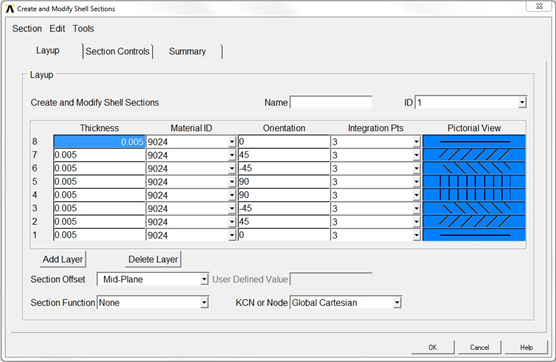 - 層 1 から 8 までの方向に 0、45、-45、90、90、-45、45、0 をそれぞれ入力します。ダイアログ ボックスは次のように表示されます。材料 ID 値は、ご使用のマテリアル ライブラリ内の材料によって異なる場合があります。