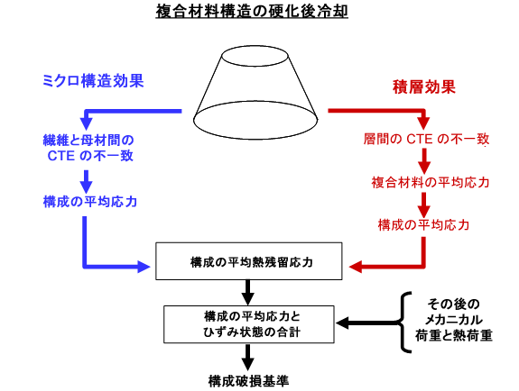 構成材料レベルでのこれら 2 つのソースの熱残留応力を、次に図解しています。構成の熱残留応力が、通常の外部の機械的および構造の熱荷重の適用によって生成される構成の応力に追加されることを示しています。