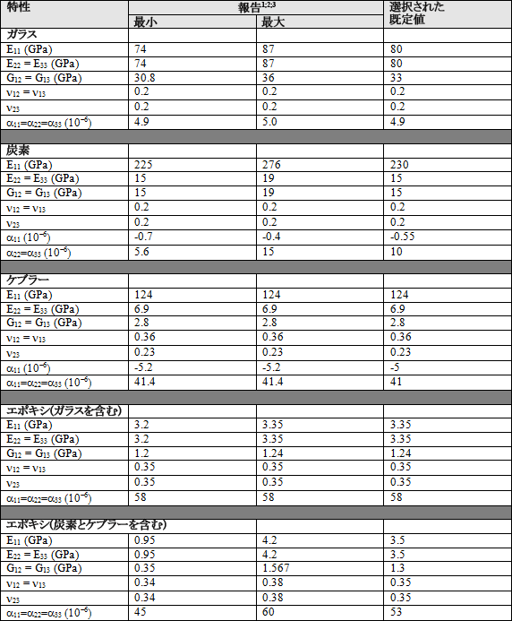 ガラス繊維、炭素繊維、ガラス繊維を含むエポキシ、および炭素繊維を含むエポキシの最初の弾性特性に使用される既定値は、最初および 2 回目の World-Wide Failure Exercises に提供されるデータの公称値として選択されました[1,2]。ケブラー繊維の最初の弾性特性に使用される既定値は、Kevlar 49 のメーカーである DuPont 社によって提供されるデータからの報告値として選択されました。ケブラー繊維を含むエポキシの既定値は、炭素繊維を含むエポキシに指定される既定値と同じになるように選択されました。これらの演習で報告される特性の範囲および既定値として選択される値を以下の表に示します。