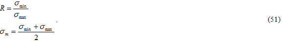式 52 と 53 を積分することで、運動学理論は、σ min を増加させて平均応力を増やした結果、R の値の増加によって疲労寿命が短くなるということを予測していることがわかります。別の視点として、一定の荷重ケース R = 1 を考えてみます。平均応力を増加させると、故障寿命が明らかに短くなります。しかし、一方向複合材料と織物複合材料の実験によれば、σ min を増やすことで疲労寿命も延びることがわかっています [47, 25-26]。このように、応力の振動特性によって、一定荷重の下では存在しない物理的な特徴が加えられると考えられます。