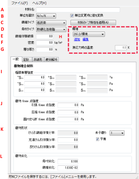 起動時に[File] > [New] > [Woven]を選択することで、Composite Material Manager GUI は次のように織物のフォーマットに切り替わります。