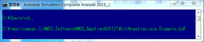 Simulation Composite Analysis は Windows バッチフ ァイルをインストールし、コマンド ラインから Simulation Composite Analysis を実行して MSC Nastran バルク データ ファイルを簡単に実行できます。