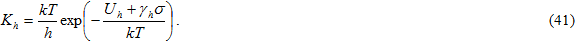 次に、方程式(38)で記述された接着破壊率と、方程式(39)で記述された接着回復率に適用される応力の効果を考慮します。このコンテキストでは、単位面積あたりの力ではなく、単位体積あたりのエネルギーの観点から応力を検討する方が有益です。応力が、接着破壊プロセスを促進する作用をしている場合は、接着破壊に対するエネルギーの障害を低減し、接着回復に必要なエネルギーの障害を増加するはずです。