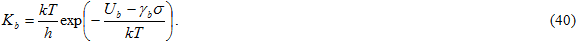 活性化体積によって異なります。これにより、活性化エネルギーの低減は単に活性化体積と応力の積となります。下の右側の図は、応力が活性化エネルギーを変化させる様子を示しています。適用された応力の効果を反映するために、方程式(38)を次のように修正します。