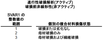 基本的な MCT 状態変数は、複合材料の個別の損傷状態を示す SVAR1 です。SVAR1 は整数変数です。SVAR1 に設定できる整数値の範囲と解釈は、有限要素解析で使用する材料の特定の非線形性機能セットによって異なります(「付録 C」を参照)。「付録 C」には、特定の例として、Simulation Composite Analysis を使用する場合に進行性破損機能をアクティブにし、非破壊前後の非線形性機能を非アクティブにすると、次の表に示すように SVAR1 は整数値 1、2、または 3 のみを取ることができることが記載されています。