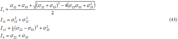 破損基準の形式を検討する場合は、実験で観測された軸外破損モードについて考えると役に立ちます。一方向複合材料の場合、疲労破損はしばしば繊維と並行な亀裂[24, 46]によって生じることが広く報告されています。したがって、繊維と直交する引張力が、これらの平面上のせん断応力とともに疲労における大きな要因となっていることが予測されます。繊維の軸方向を 1 の方向とし、現場の母材破損基準を、以下の形式をとる MCT を使用して計算された母材応力テンソルの横等方性不変量の形式として示します。