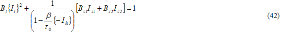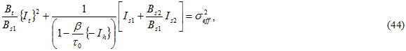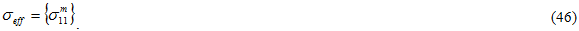 また、{} は Macaulay ブラケットを示し、ブラケット内の単位量がマイナスの場合値は 0 (ゼロ)になります。Bi の値は複合材料に対する横方向引張、横方向圧縮および面内せん断の 3 つの静的破損テストにより決定されます。各テストには母材構成の破損が含まれます。式 42 を Bs1 で除算すると、有効応力 σ eff の形式が求められます。