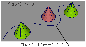 次の図で使用されているモーション パスは 1 つだけです。カメラがモーション パスに沿って移動しても、カメラ ビューは常にカメラ アイの真正面にあります。カメラ ビューはオブジェクトの間を縫うように進むので、オブジェクトが視界から外れることもあります。