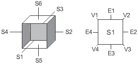 以下の例では、S1からS6のサーフェス(フェース)を持つ立方体のソリッドモデルを示します。S1からS6は、立方体をソリッドモデルとして定義するために必要なジオメトリとトポロジ情報を構成します。それぞれのサーフェスにはループのセットがありますが、ここでは 1 つのサーフェスに 1 つのループのみがあるとします。S1のループには、4つのエッジと4つの頂点があります。