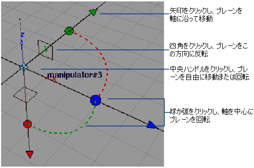 - 矢印をクリックすれば、中心のハンドルが自由移動ハンドルに変わります。続いて中心のハンドルをドラッグすれば、自由にプレーンを移動できます。