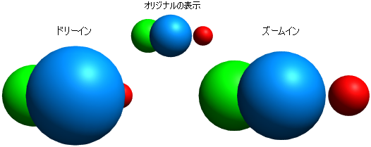 ズームとドリーは共に、カメラのウィンドウに表示されたとおりに、シーンにあるすべてのオブジェクトのサイズを変化させます。しかし、ドリーを行うと、カメラから離れたところにあるオブジェクトと相対的にカメラの近くにあるオブジェクトのサイズも変更されてしまいます。ズームの場合は、シーン内のオブジェクトの相対的なサイズが維持されます。ドリーを実行すると、カメラの物理的なロケーションを移動します。ズームを実行すると、カメラのレンズの焦点距離が変更されます。