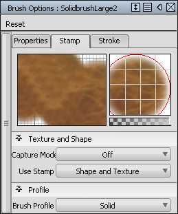 - Brush Options ウィンドウを開き、Stamp タブを選択します。Capture Mode ポップアップ メニューから、Shape and Texture オプションを選択します。