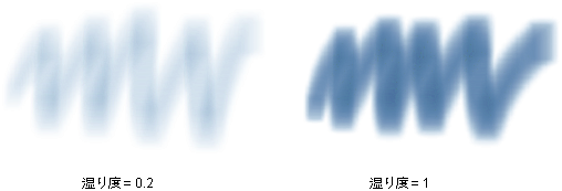 Wetnessが高い場合は(たとえば0.9)、Wetnessが低い場合(たとえば0.1)より、キャンバスプレーンにすみやかにペイントされます。このため、スタイラスを速く動かしたり遅く動かしたりするだけで、1本のマーカーでさまざまな種類のストロークを作成できます。