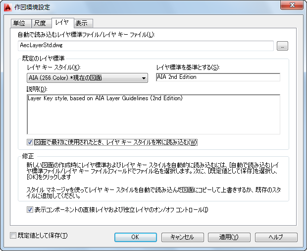 [作図環境設定]ダイアログ ボックスのレイヤ設定。レイヤ キー スタイルは自動読み込みに設定され、[既定値として保存]がオンになることに注意してください。これにより、テンプレートなしで図面を開始した場合でも、確実に正しいレイヤ キー スタイルが読み込まれます。[図面で最初に使用されたとき、レイヤ キー スタイルを常に読み込む]がオンになっていることにも注意してください。これは図面ベースの設定で、テンプレートに設定する必要があります。これにより、最新のレイヤ キー スタイルが、すでに進行中の図面でも使用されます。