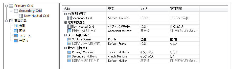 カーテン ウォール ユニット内にネストしたグリッドを作成するには、次の手順を実行します。ネストしたグリッドとは、グリッド内のグリッドです。それぞれのネストしたグリッドには、独自の分割、セル割り当て、フレーム、マリオンがあります。既定では、ネストしたグリッドに対してフレームが選択解除になります。