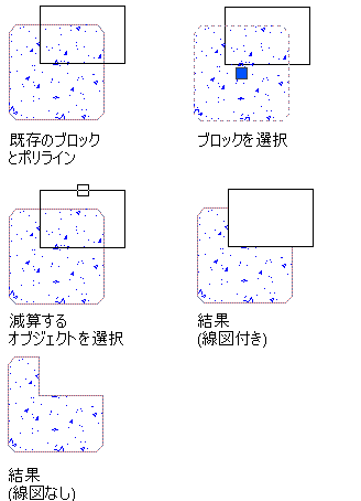 選択した部分を、線図、AEC ポリゴン、マス要素押し出し、スペース、あるいはこれらのいずれかのオブジェクトを含むブロックから差し引くには、次の手順を実行します。この操作では、残りのコンポーネントを再描画する必要がありません。長方形の角を差として指定することもできます。差し引く部分には、線分、ポリライン(閉じたまたは開いた)、円弧、円、テキスト、またはハッチングを含むことができ、あるいはこれらで作図したものであってもかまいません。この減算操作によって閉じたポリラインの一部を削除した場合、ポリラインは閉じたものとして再作成されます。この減算操作によって閉じたポリラインが 2 つに分割された場合、分割後の 2 つの部分とも閉じたポリラインとして再作成されます。ただし、減算によってハッチングが 2 つに分割された場合、ハッチングは 1 つの線図による図形のままですが、分割部分はクリックすることで個別に選択できます。