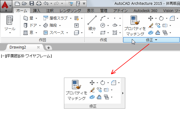 一部のリボン コマンドは、ドロップダウン メニューにグループ化されています。これらのコマンドにアクセスするには、コマンドの横にある矢印をクリックします。