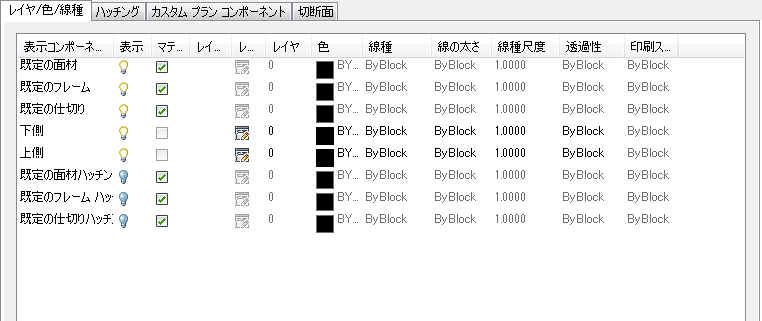 | [切断面の高さ]より高い位置 | レイヤ/色/線種]タブの[切断面上]コンポーネントに指定されているプロパティを使ってオブジェクトが表示されます。 |