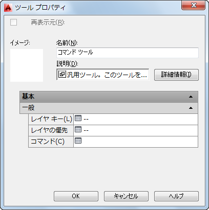 | イメージ | 既定では、コマンド ツールに関連付けられているイメージはありません。ツールの機能を示すイメージを追加するには、空のイメージ領域で右クリックし、イメージを選択します。 |