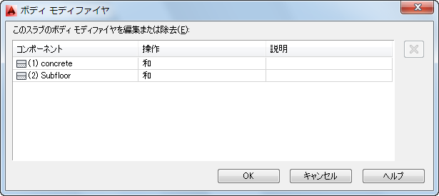 スラブまたは屋根スラブの 3D ボディ モディファイヤを編集または除去するには、次の手順を実行します。ボディ モディファイヤを適用するコンポーネントや、適用方法(選択したコンポーネントに追加、除外、置き換えのどれを実行するか)を変更することができます。また、ボディ モディファイヤの説明を入力または編集することも可能です。