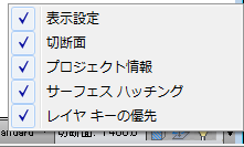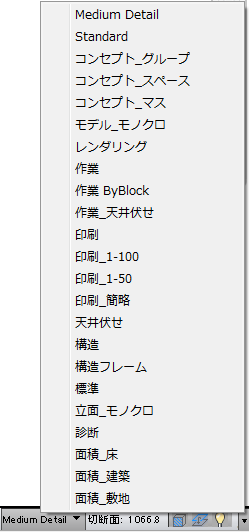 図面のステータス バーで表示できる設定およびコマンドのドロップダウン リスト。