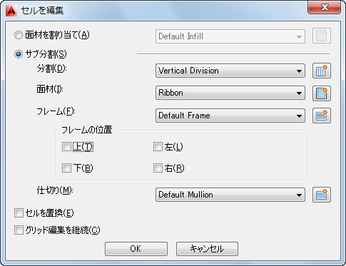 | 分割、面材、フレームで選択したセルを分割するには | [サブ分割]を選択します。 |