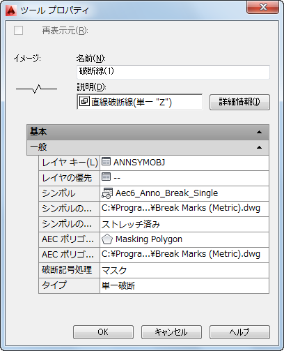 - 破断線ツールでは、破断線記号と同じ図面に支援要素を含めます。集計タグなどの他のマルチコンポーネント ツールと同様に、将来の変更が容易になります。破断記号がオブジェクトをマスクするかトリムするかを含め、破断記号のプロパティは、すべてツール プロパティ内で設定します。