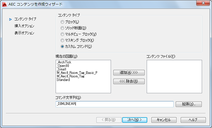 - 標準の AutoCAD 寸法用のツールを作成する場合は、AEC コンテンツ ウィザードを使用します。これにより、[カスタム コマンド]オプションとレイヤ キーを使用して、寸法が正しいレイヤに配置されるようにできます。