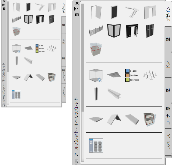 ツール パレット セットの表示は、ツール パレット セット全体に対して指定した設定と個々のツール パレットごとに指定した設定によって決まります。ツール パレット セットで、ツール パレット セットの透過性、サイズ、位置、自動非表示を指定します。