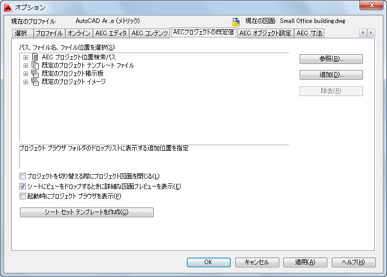 現在の図面に既定の AEC プロジェクトの既定値オプションを指定する