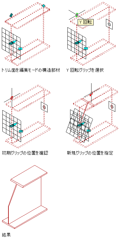 構造部材はトリム面と呼ばれるオブジェクトを使用してトリムされます。これにより、複数の構造部材間の接合部や、構造部材と他のオブジェクト間の接合部をクリーンアップすることができます。構造部材ツールのプロパティ パレットを使用して、ツールで新しい部材を追加する際に適用される特定のトリム面を作成できます。または、トリム面が、既に作図内に存在する構造部材に新しい部材を接続するときに自動的に作成されるように指定することもできます。いったん部材が作図に追加されると、そのトリム面を編集したり、新しいトリム面を追加することができます。追加するトリム面は、部材自体の上や、別のオブジェクトのエッジに関して定義できます。
