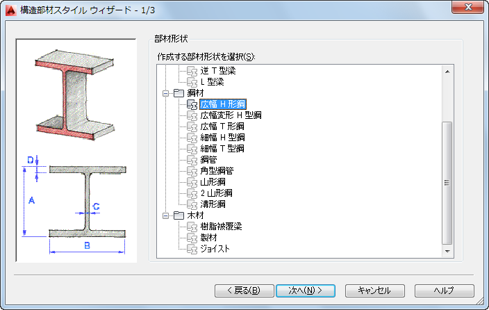 作成する部材のタイプ、形状、寸法が分かっている場合は、それらの情報を構造部材スタイル ウィザードから入力することで、目的のスタイルをすばやく作成できます。スタイル内の構造部材形状は、カタログ内の部材形状のいずれかに基づいて作成できます。
