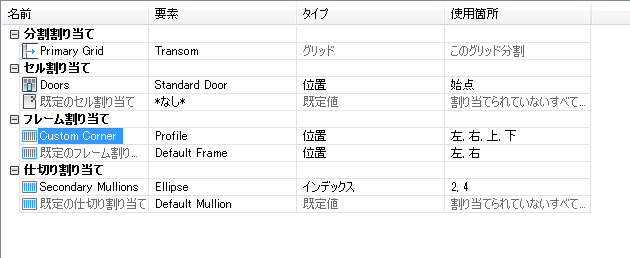 組合せ窓スタイルの要素定義の作成が終わったら、分割、セルの面材、フレーム、マリオンという組合せ窓の各要素タイプにその定義を割り当てることができます。