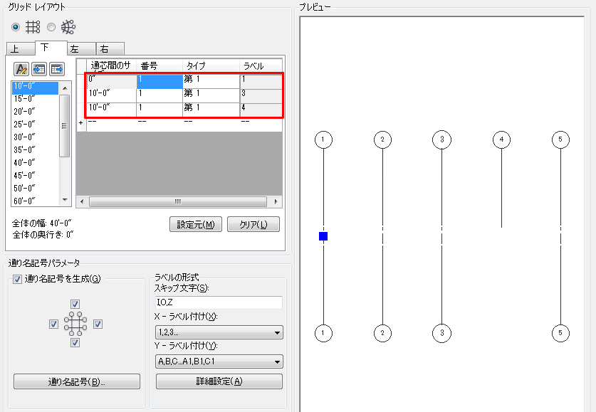 - 最初に、通芯線の数が多い側のグリッド レイアウトを生成します。たとえば、上に線 1、2、3、4、5 があり、下に線 1、3、4、5 があるグリッドを作成する場合は、最初に[上]タブを選択し、4 つのグリッド スパンを必要な間隔で入力します。