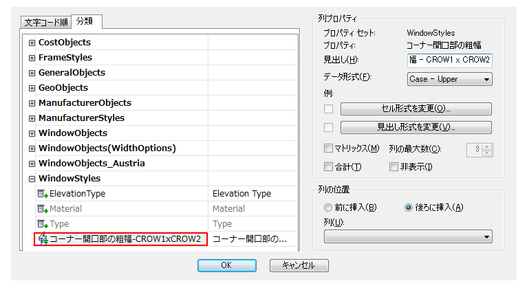 [列を追加]ダイアログ ボックスの[窓スタイル]領域で[コーナー開口部の粗幅 - CROW1 x CROW2]を選択します。