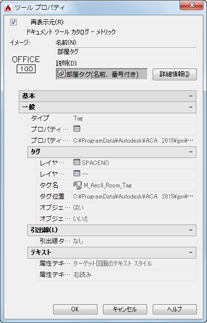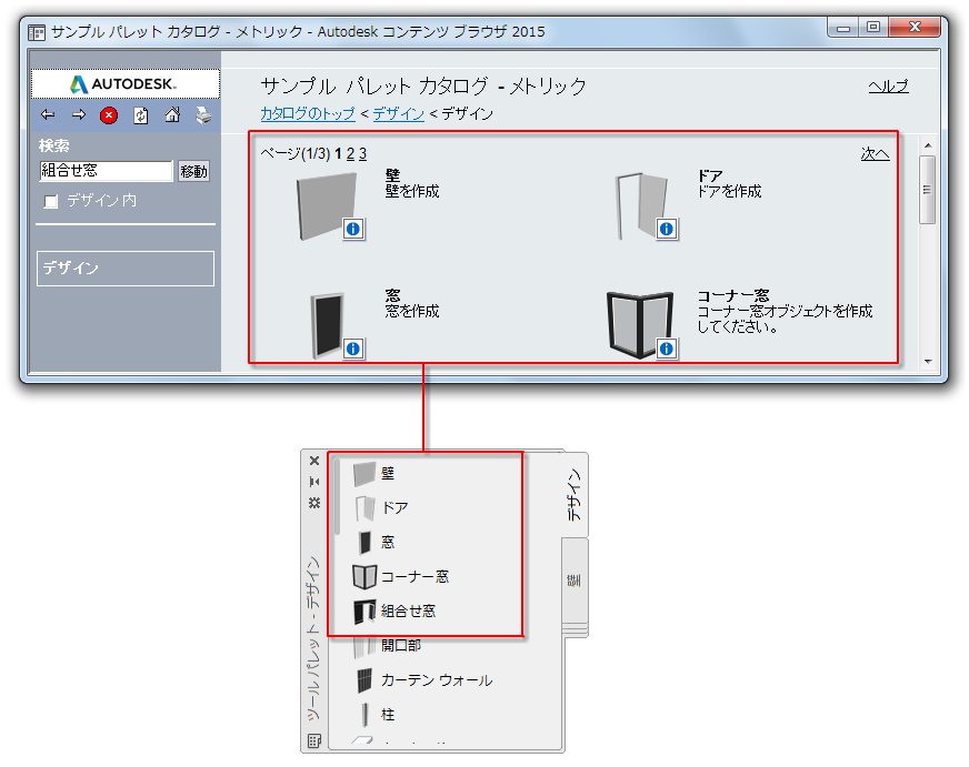 [コンテンツ ブラウザ]内のカタログのツールを AutoCAD Architecture 内のツール パレットにリンクするには、次の手順を実行します。