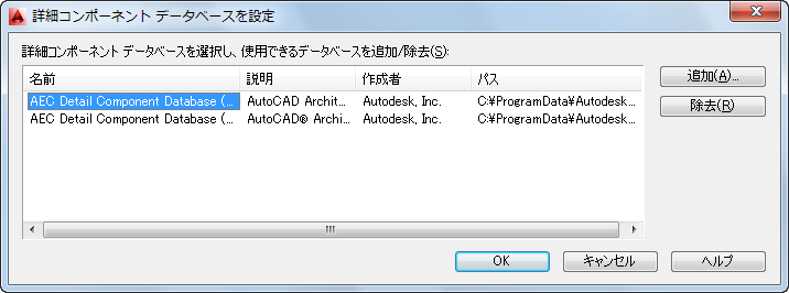 8. [プロジェクト以外の詳細コンポーネント データベースを表示]で、プロジェクトに指定されている詳細コンポーネント データベース以外に、[オプション]ダイアログ ボックスの[AEC コンテンツ]タブに含まれるすべての詳細コンポーネント データベースを表示するかどうかを指定します。