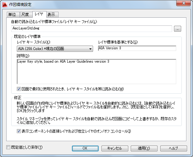 | テンプレートを使用しないか、作図環境設定の情報を含まないテンプレートから作成する新しい図面に、レイヤ設定を既定の設定として保存するには | [既定値として保存]をオンにして、[OK]をクリックします。[単位]タブと[尺度]タブの設定も、既定の設定として保存されます。 |