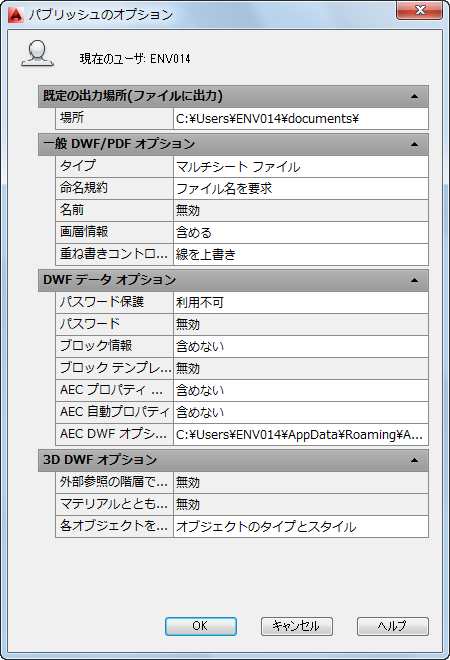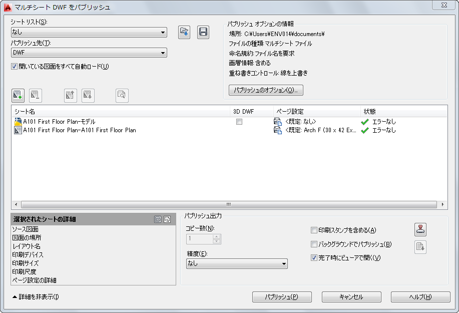 - [マルチシート DWF をパブリッシュ]ダイアログ ボックスで、[パブリッシュ]を選択します。