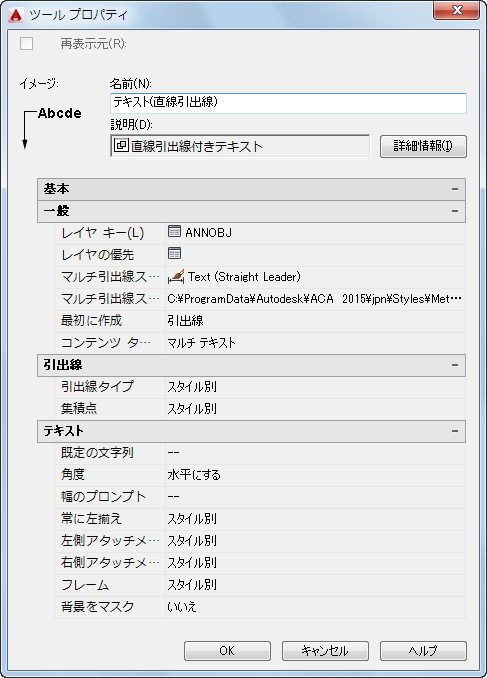 | マルチ引出線スタイル | 注釈のマルチ引出線スタイルを指定します。使用可能なスタイルには、[テキスト]、[ブロック]、[標準]などがあります。 |