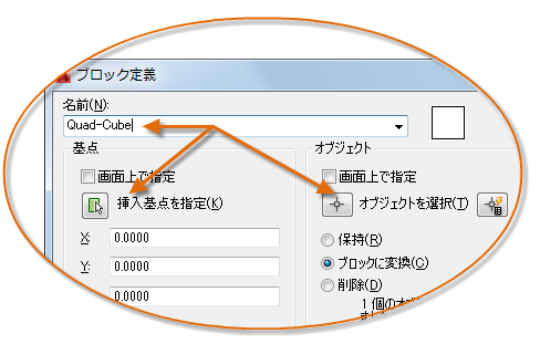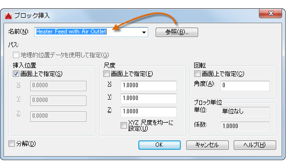 挿入すると、ブロック定義が現在の図面に保存されます。それ以降は、[参照]ボタンをクリックせずに[名前]ドロップダウン リストからブロックを選択することができます。