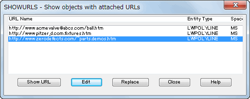 SHOWURLS と入力して、[Showurls]ダイアログ ボックスを表示します。1 つの URL をクリックして表示したり、1 つまたは複数の URL をクリックして編集または置換することができます。