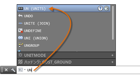 コマンドを入力し始めると、コマンドが自動的に表示されることに注目してください。下の例のように、複数の選択肢がある場合は、直接クリックしたり、矢印キーで希望の選択肢に移動してから[Enter]や[Spacebar]を押すことで選択することができます。